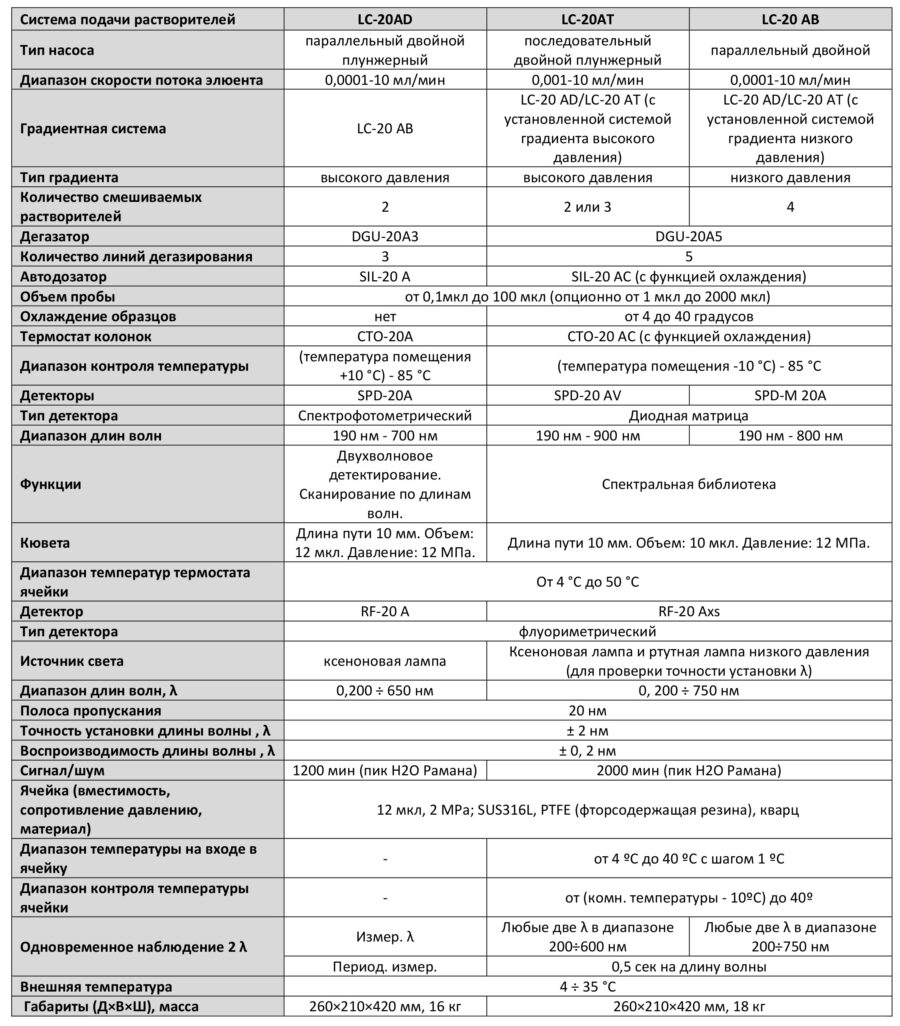 Модульный дизайн хроматографов LC-20 Prominence позволяет подобрать конфигурацию прибора, идеально подходящую для решения конкретной аналитической задачи. Для создания нужной конфигурации прибора пользователю предлагается большой выбор высокоточных насосов с различными диапазонами давления (до 40 МПа или до 66 МПа), автоинжекторов, термостатов, коллекторов фракций и разнообразных детекторов, включая спектрофотометрические (дисперсионные различных диапазонов и диодно-матричный), флуоресцентный, рефрактометрический, кондуктометрический, электрохимический (амперометрический), светорассеивающий. Кроме того, жидкостный хроматограф LC-20, обеспечивающий подачу растворителя в широком диапазоне и минимальную величину переноса остаточного загрязнения, может быть укомплектован всем спектром хромато-масс-спектрометрических детекторов Шимадзу для проведения количественного и качественного анализа как относительно простых, так и сложных веществ, а также идентификации неизвестных соединений.