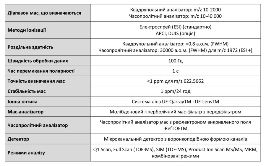 Для виконання аналітичних робіт, що вимагають дуже високої чутливості, використовуються хромато-мас-спектрометри з потрійним квадруполем моделей LCMS-8050 і LCMS-8060. Однак наявність навіть високочутливих трьох-квадрупольних приладів не дозволяє вирішувати іншу важливу задачу – надійне виявлення всіх органічних сполук, одержуваних в процесі синтезу, включаючи встановлення їх структури. Для вирішення цього завдання ефективним є хромато-мас-спектрометр LCMS-9030, що поєднує квадрупольний і часопролітний мас-аналізатори. У конструкції LCMS-9030 використані нові запатентовані технології, що забезпечують високий рівень дозволу по масам і точне визначення молекулярної маси. Це є визначальним фактором при ідентифікації невідомих сполук і встановлення структури молекул. На додаток до встановленого за замовчуванням джерела іонізації електроспреєм (ESI), прилад LCMS-9030 може доукомплектовуватись джерелом хімічної іонізації при атмосферному тиску (APCI) і комбінованим джерелом іонізації (DUIS), який дозволяє одночасно здійснювати іонізацію проби в режимі електроспрея і в режимі хімічної іонізації при атмосферному тиску.