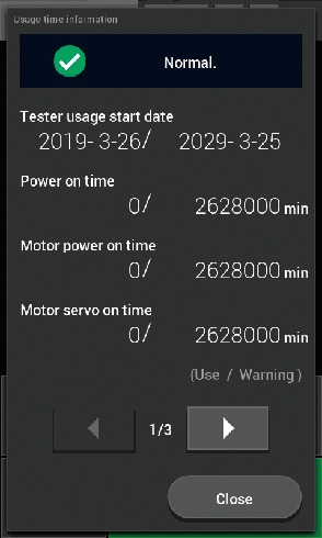 The machine continuously monitors the calibration of the sensor amplifiers, the current operating status, the power supply voltage, and external connected devices. If any problems or errors occur, the software displays a warning message. You can also control the total operating time and the number of times the machine has been turned on. When the set limit is reached, the machine will warn you. This function is generally used for regular periodic inspections and maintenance. (No degradation of the load cells and extensometers over time has been detected. Periodic inspection and maintenance by a service engineer is recommended).