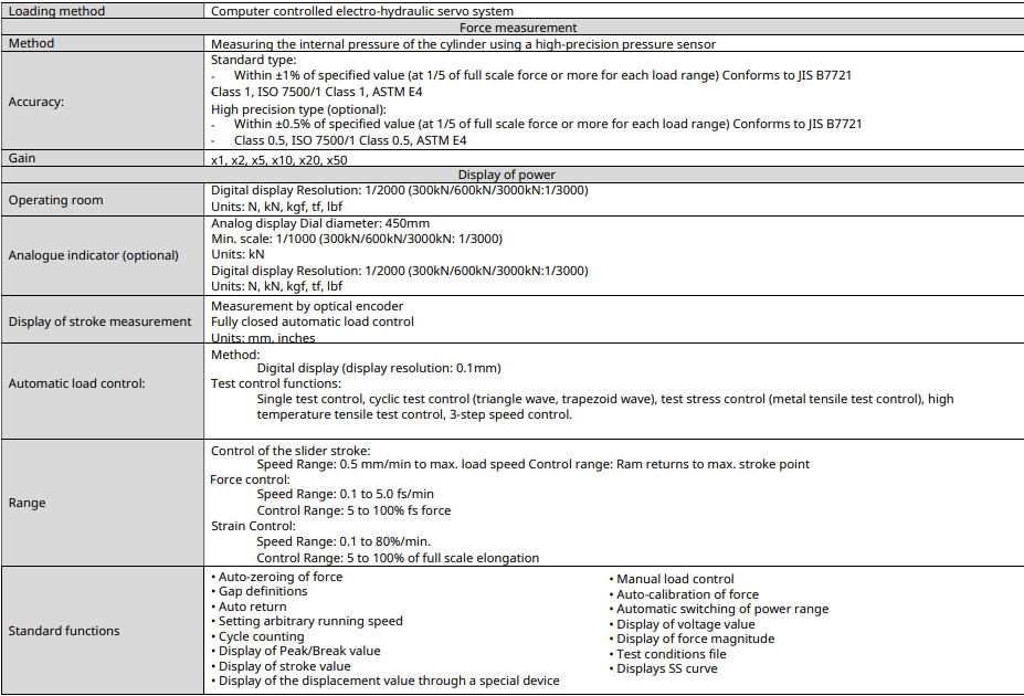 • Wide range of applicable loads. It is possible to supply standard equipment with a capacity of 200, 300, 500, 600 1000 kN, as well as especially powerful equipment up to 4000 kN for tensile, compression and bending tests.