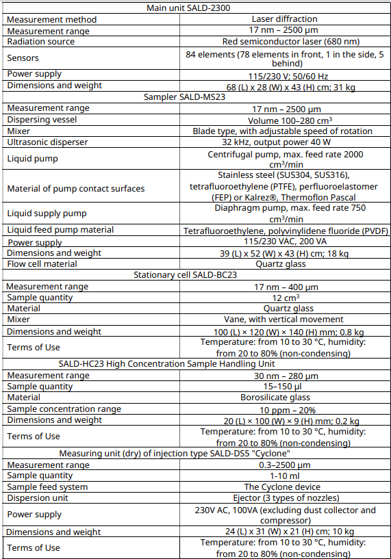 The device is designed to measure particle size distribution in the range from 17 nm to 2500 μm and is currently an important tool in quality control laboratories of enterprises in the electronic, pharmaceutical, cosmetic, food, paint and varnish and other industries. The main unit of the SALD-2300, depending on the objects of analysis, is equipped with modules for conducting «dry» or «wet» measurements, as well as modules for analyzing highly concentrated samples.