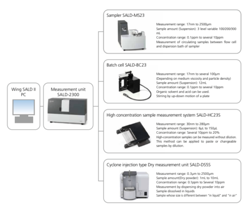 - Using the SALD-MS23 sampling device allows for a wide measurement range. For example, polystyrene latex particles with an average diameter of 50 nm and steel balls with a diameter of 2 mm can be measured on the same instrument.