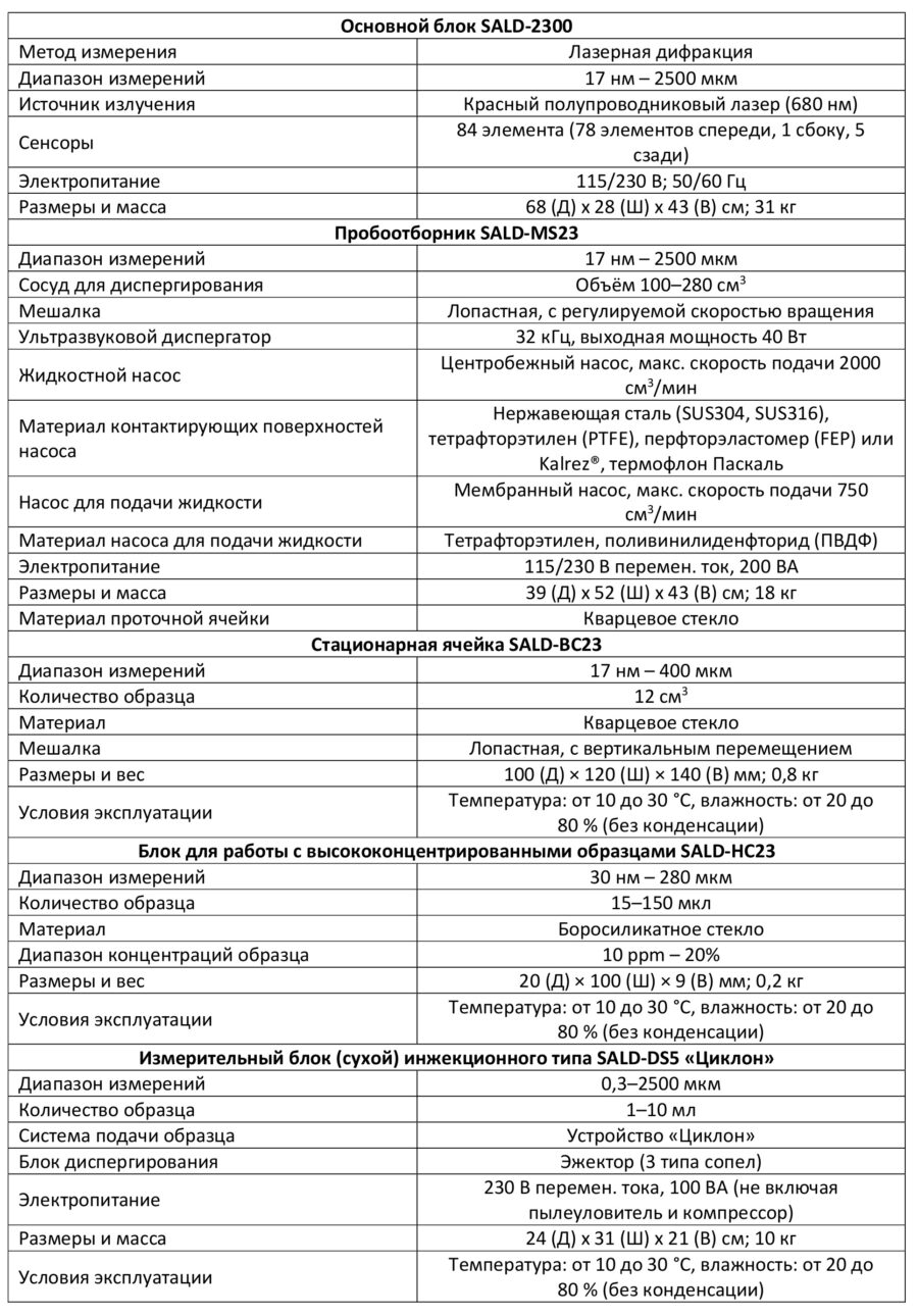 Прибор предназначен для измерения распределения частиц по размерам в диапазоне от 17 нм до 2500 мкм и на сегодняшний день является важным инструментом в лабораториях контроля качества предприятий электронной, фармацевтической, косметической, пищевой, лакокрасочной и других отраслей промышленности. Основной блок SALD-2300 в зависимости от объектов анализа, комплектуется модулями для проведения «сухих» или «мокрых» измерений, а также модулями для анализа высококонцентрированных образцов.