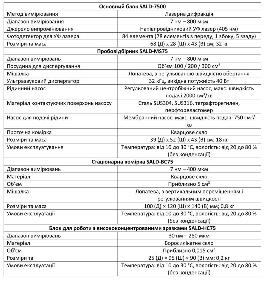 - Прилад розрахований для оцінки розміру часток в широкому діапазоні вимірювань від 7 нм до 800 мкм і придатний для вимірювання зразків з концентраціями частинок від 0,1 ppm до 20 мас. %, При цьому можна оцінити залежність розподілу часток за розмірами від концентрації.
