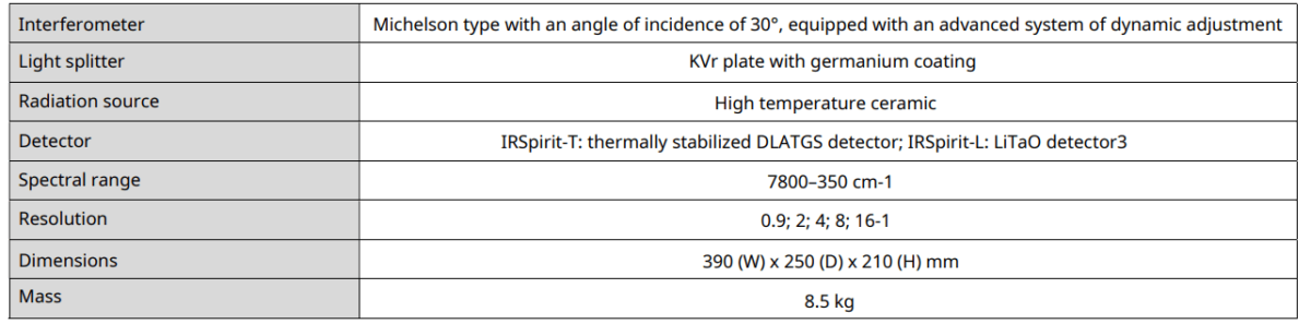 The compact IR Fourier spectrometer is based on a sealed Michelson interferometer. The device uses a semiconductor IR laser with temperature control and a high-energy infrared radiation source that has proven itself well. Depending on the user’s tasks and wishes, the device can be equipped with one of two types of detectors: LiTaO3 or DLATGS with temperature control.