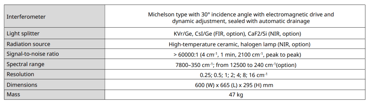 If necessary, the spectral range of the instrument can be extended to the far-IR region (up to 240 cm-1) or to the near-IR region (up to 12500 cm-1). Along with the standard thermostabilized DLATGS detector, a highly sensitive cryogenic MCT detector or a detector sensitive to the near-IR region of InGaAs radiation can be installed.