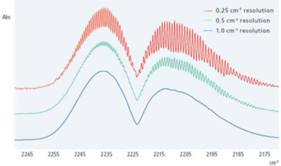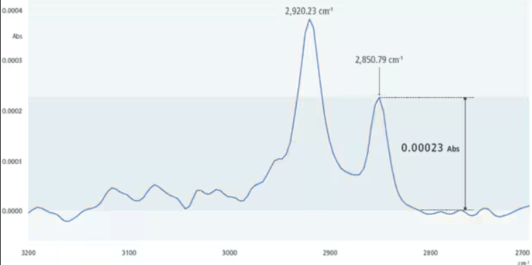 Using IRXross with ATR attachment, it is possible to obtain a signal-to-noise ratio of 55,000:1, which provides ultra-high sensitivity of measurements. The system is able to detect even an extremely weak absorption signal at the level of 0.00023 with good sensitivity. The resolution of the device, which is 0.25 cm-1, shows peaks around 2230 cm-1. It is possible to use a KRS-5 window, which retains moisture resistance up to 90% relative humidity (for temperatures up to 30 °C) and meets the pharmacopoeial wavenumber requirement for the range from 350 to 7800 cm-1