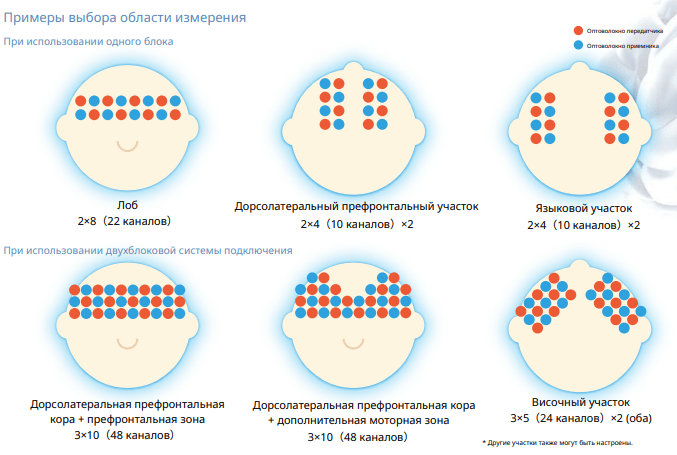 - Держатель типа B — обеспечивает многозональные измерения, позволяющие анализировать не только лобовую долю, но и моторные, соматосенсорные и зрительные области. Это делает его незаменимым в физиологии упражнений, биоинженерии и промышленных исследованиях, где требуется подробное изучение мозговой активности в разных регионах.