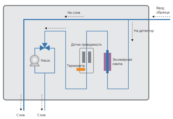 • Новая технология Shimadzu «Active-Path» обеспечивает эффективное УФ-окисление, интегрируя линию потока пробы непосредственно в лампу.
