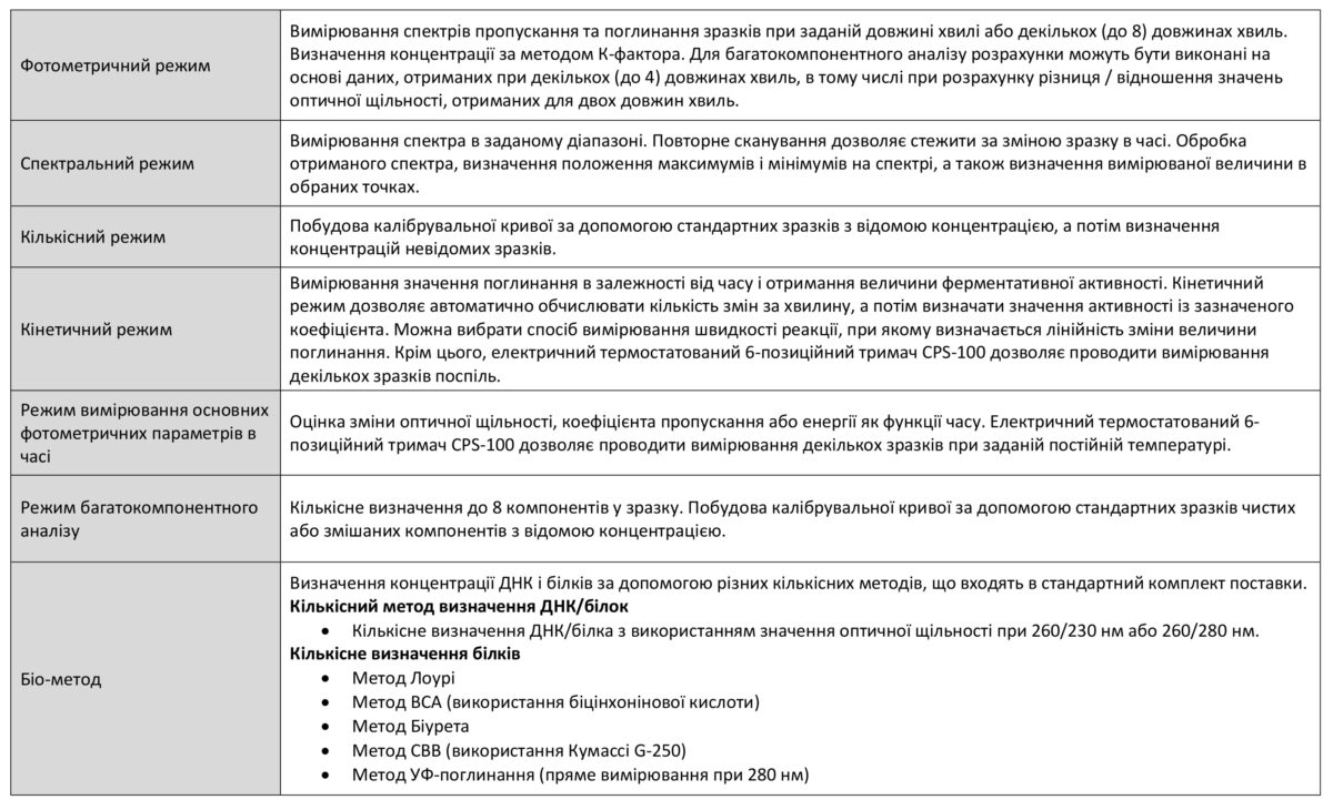 Безліч запрограмованих режимів і методів дозволяють легко проводити різні типи вимірів. Основні режими: фотометричний, спектральний, кінетичний. Серед методів необхідно відзначити окремо винесений метод кількісних визначень за допомогою побудови калібрувальних графіків, багатокомпонентний аналіз і різні біометоди для визначення нуклеїнових кислот і білків.